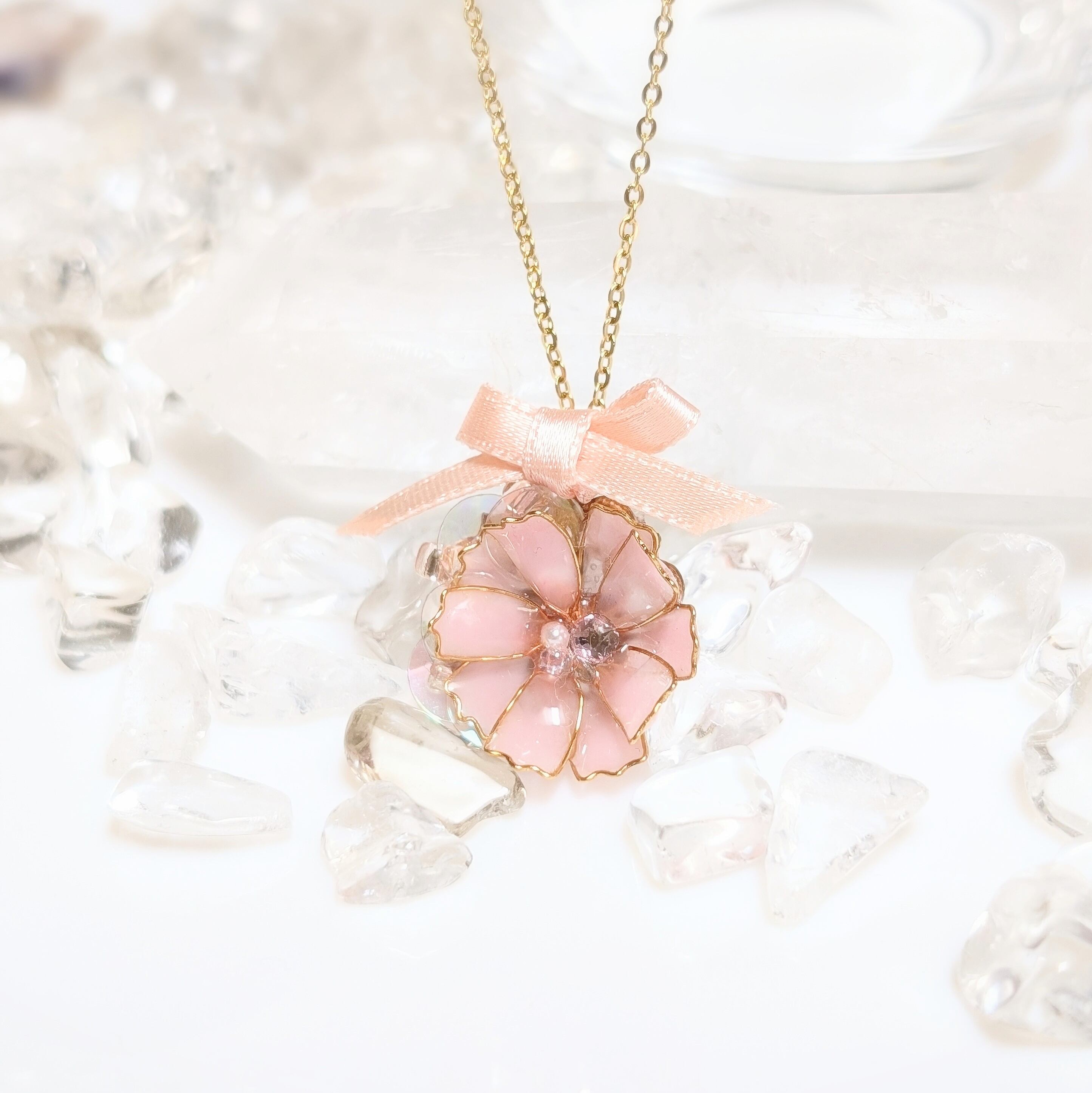 優しいピンクのお花の周りにビーズをあしらい